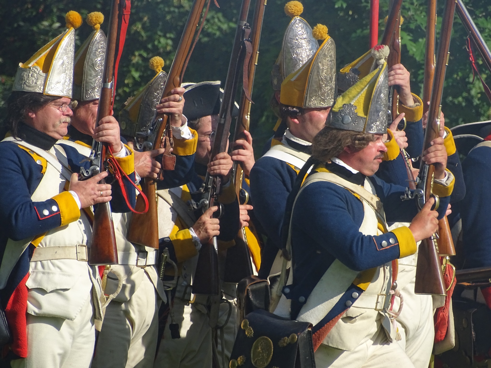 Die Schläge der Marschtrommeln hallen dumpf und bedrohlich über die Wiesen, Regimentsfahnen flattern zaghaft im Wind. Zunächst kommt noch der geordnete Befehl zum Laden der Waffen: die Spitze der in Papier verpackten Schwarzpulverladung abbeißen, die Pfanne des Steinschlosses öffnen, etwas Pulver einfüllen, die Pfanne schließen, den Rest des Pulvers in die Laufmündung schütten, eine Bleikugel in die Mündung rollen lassen und mit dem Ladestock so tief wie möglich nach unten in den Lauf stoßen.